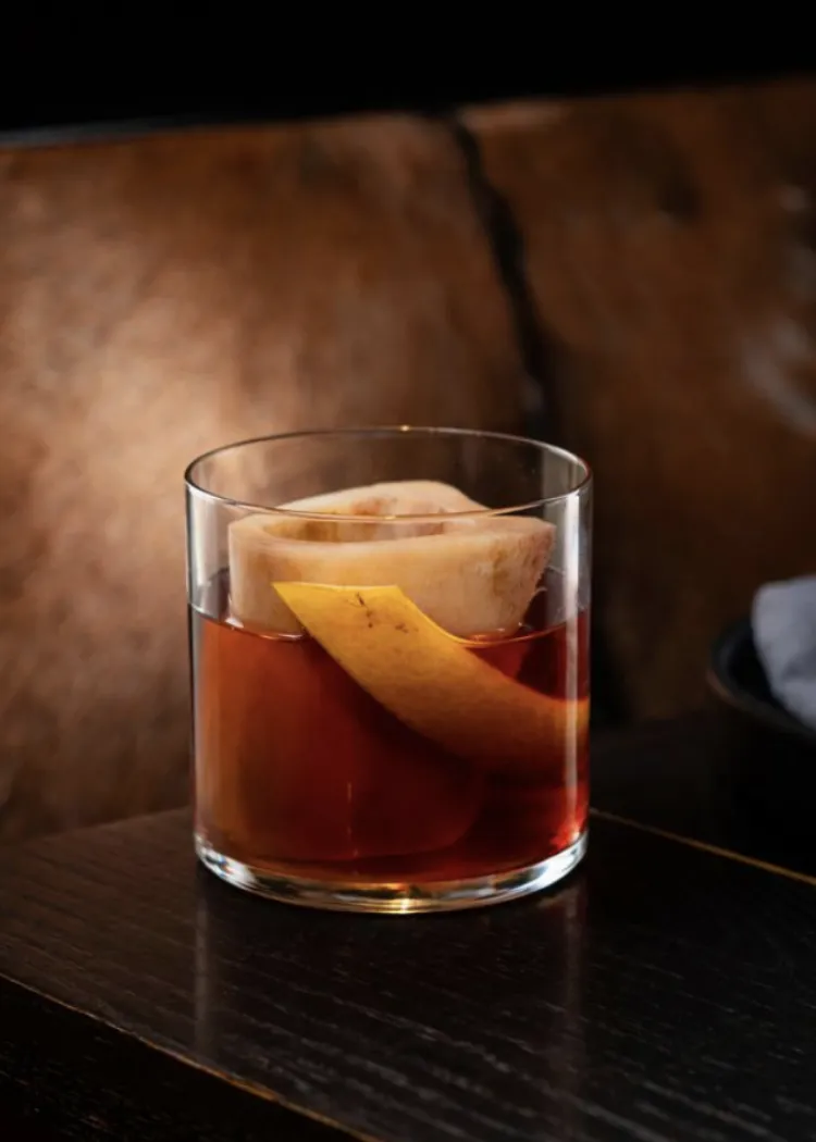 Gin Puerto de Indias Peach & Orange, Aperol, Chartreuse Verde y clarificado de manzana.