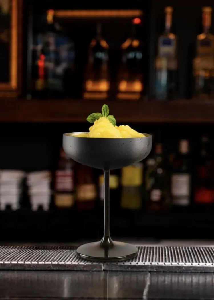 Descripción: Ginebra Tanqueray Bossa nova, Prosecco y sorbete de mango con final de menta.